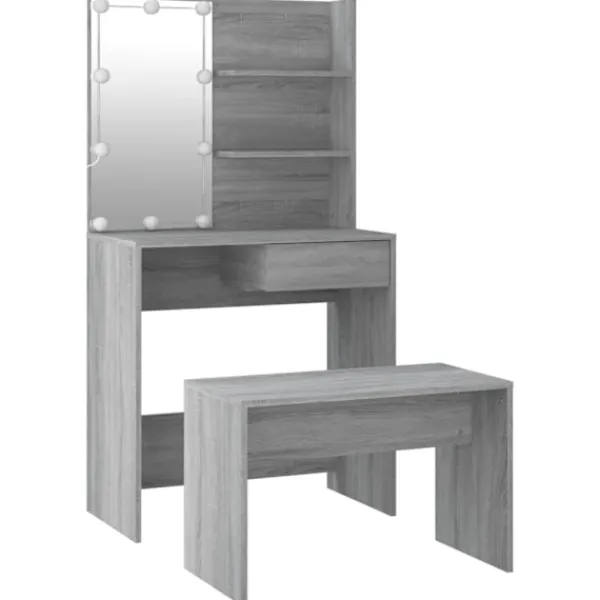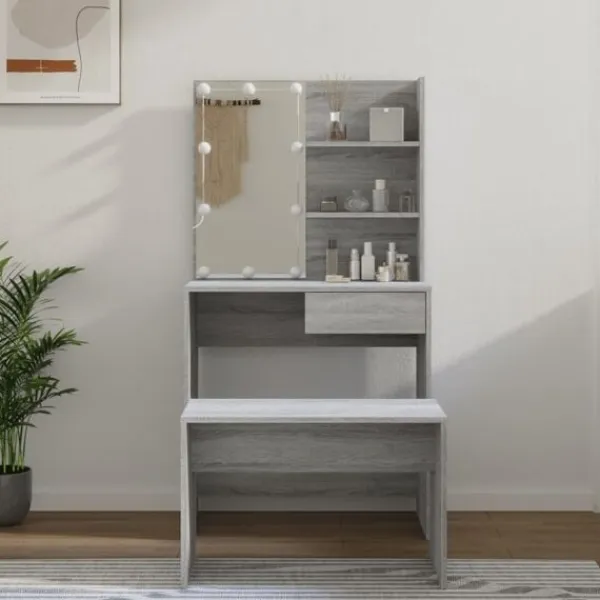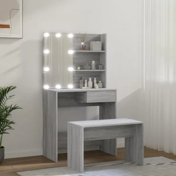 Detta trendiga sminkbord ger ditt sovrum ett tidlöst, elegant utseende. Sminkbordet med LED är ett utmärkt komplement till din sovrumsinredning samtidigt som du har din kosmetika nära till hands! Stabilt material: Det konstruerade träet är av exceptionell kvalitet med slät yta och är också starkt, stabilt och fuktbeständigt.Spegel: Sminkbordet med spegel är perfekt för din dagliga skönhetsrutin. Spegeln låter dig ta hand om din hud och den underlättar när du sminkar dig!Gott om förvaringsutrymme: Sminkbordet med pall har gott om utrymme för enkel åtkomst till smink, smycken och vardagliga nödvändigheter.LED-ljus: Sminkbordet har också LED-lampor med USB, som är enkla att byta läge från varmt till kallvitt. LED-lamporna runt spegeln avger ljus.Breda applikationer: Detta sminkbord är lämpligt för olika scener, till exempel ditt sovrum, garderob och alla andra rum du vill ställa det. VARNING:För att förhindra att den välter måste denna produkt användas med den medföljande monteringsanordningen för vägg Observera:Varje produkt levereras med en monteringsmanual i lådan för enkel montering.