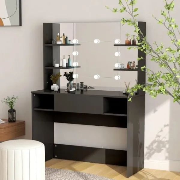 Utför din morgonrutin med stil vid detta eleganta sminkbord! Detta sminkbord, konstruerat av MDF, blir en elegant och modern del av ditt hem. Den har gott om plats för sminkartiklar och håller allt på sin plats. Spegeln är en bra hjälp när du sminkar dig och utstrålar en elegant känsla på bordet. De eleganta LED-lamporna belyser också din skönhet. Obs: Denna produkt har en USB-kontakt, men den certifierade 5V USB-strömkällan ingår inte.