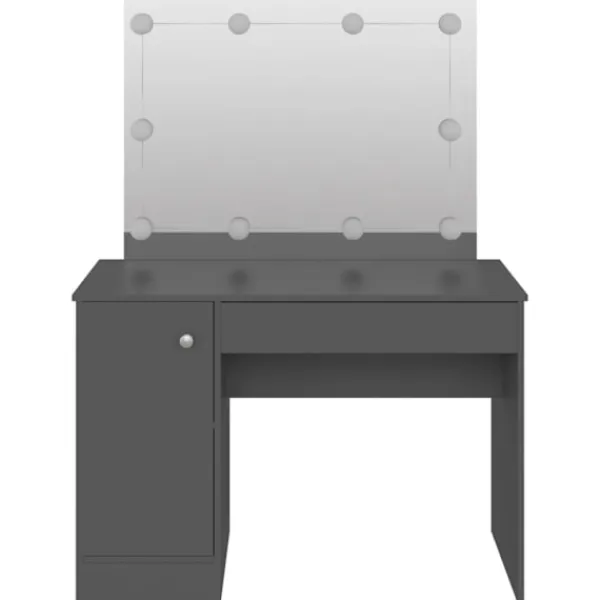 Utför din morgonrutin med stil vid detta eleganta sminkbord! Detta sminkbord, konstruerat av MDF, blir en elegant och modern del av ditt hem. Den har gott om plats för sminkartiklar och håller allt på sin plats. Spegeln är en bra hjälp när du sminkar dig och utstrålar en elegant känsla på bordet. De eleganta LED-lamporna belyser också din skönhet. Obs: Denna produkt har en USB-kontakt, men den certifierade 5V USB-strömkällan ingår inte.