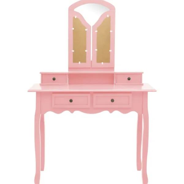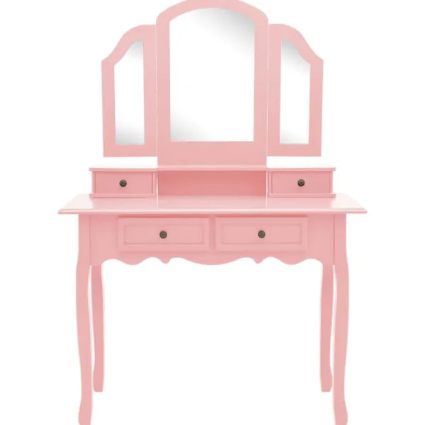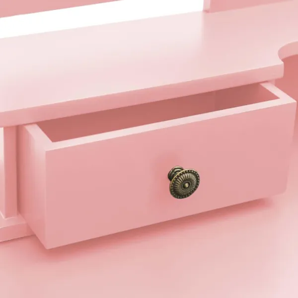 Detta charmiga sminkbord med tillhörande pall är tillverkat i högkvalitativt paulowniaträ. Dess viktorianska stil och rena, rosa finish tillför ett stänk av elegans och skönhet till din budoar, salong eller ditt omklädningsrum. Det utsökta hantverket är ännu en enastående egenskap hos denna uppsättning med bord och pall. Det har en 3-i-1 spegel, 2 sidospeglar som är hopfällbara med hållbara gångjärn. Du kan vinkla dem till önskad vinkel. Spegelramen och bordet kan användas separat. Dess fyra chica lådor erbjuder dig extra utrymme för dina smycken, kosmetika och andra privata tillhörigheter. Sminkbordet med pall blir ett riktigt blickfång var det än står.