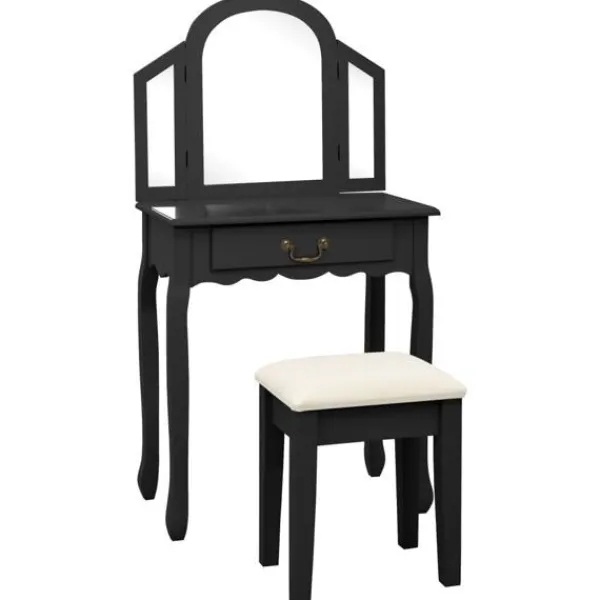 Vårt lyxiga sminkbord med pall är den perfekta platsen att sminka dig på morgonen och förbereda dig för dagen. Det har även fantastiska förvaringsmöjligheter för dina smycken och andra skönhetssaker. Sminkbordet med oval spegel och en pall blir ett riktigt blickfång i sovrummet. Lådan har gott om plats att förvara smink som du använder varje dag på et prydligt sätt. Pallen med tjock stoppning låter dig sitta bekvämt när du gör dig i ordning. När den inte används kan pallen förvaras under bordet för att spara plats. Dessutom är bordet hållbart och lätt att underhålla.