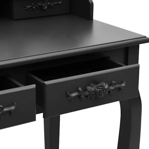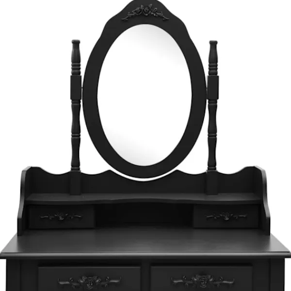 Utför din morgonrutin i stil med vårt eleganta och charmiga sminkbord! Detta sminkbord tillverkat i paulowniaträ är en fin möbel tack vare dess lyxiga stil. Dess fyra olika lådor och öppna fack erbjuder gott om plats för förvaring av smink och smycken. Bordsskivan är också en utmärkt plattform för att ställa parfymer eller liknande. Den medföljande pallen har en vadderad sits och en matchande bas i trä. Dessutom har den inbyggda speglar.