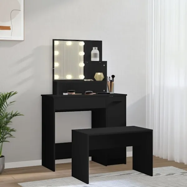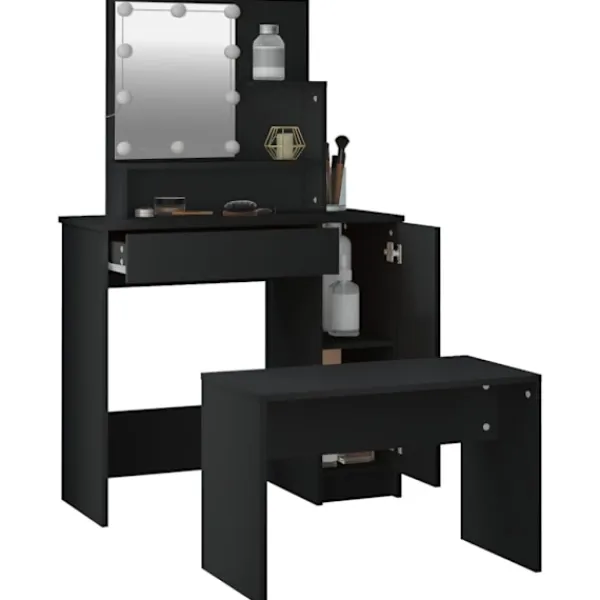 Detta trendiga sminkbord ger ditt sovrum ett tidlöst, elegant utseende. Sminkbordet med LED är ett utmärkt komplement till din sovrumsinredning samtidigt som du har din kosmetika nära till hands! Stabilt material: Det konstruerade träet är av exceptionell kvalitet med slät yta och är också starkt, stabilt och fuktbeständigt.Spegel: Sminkbordet med spegel är perfekt för din dagliga skönhetsrutin. Spegeln låter dig ta hand om din hud och den underlättar när du sminkar dig!Gott om förvaringsutrymme: Sminkbordet med pall har gott om utrymme för enkel åtkomst till smink, smycken och vardagliga nödvändigheter.LED-ljus: Sminkbordet har också LED-lampor med USB, som är enkla att byta läge från varmt till kallvitt. LED-lamporna runt spegeln avger ljus.Breda applikationer: Detta sminkbord är lämpligt för olika scener, till exempel ditt sovrum, garderob och alla andra rum du vill ställa det. Varning:För att förhindra att den välter måste denna produkt användas tillsammans med det medföljande väggfästet.