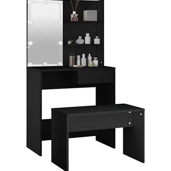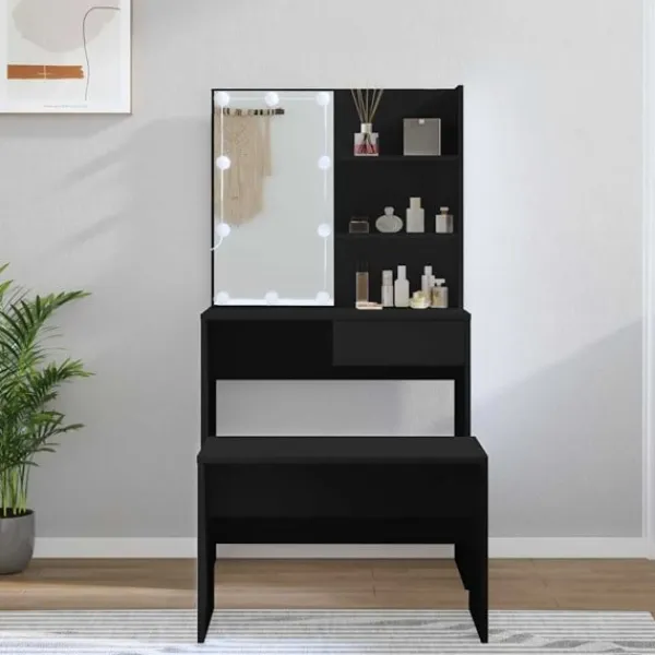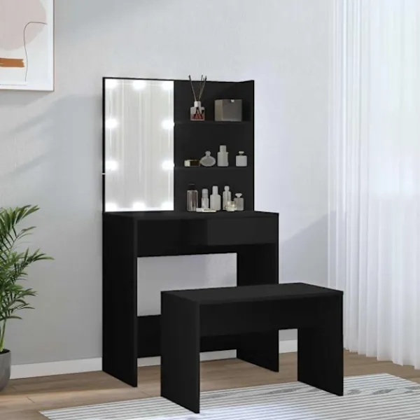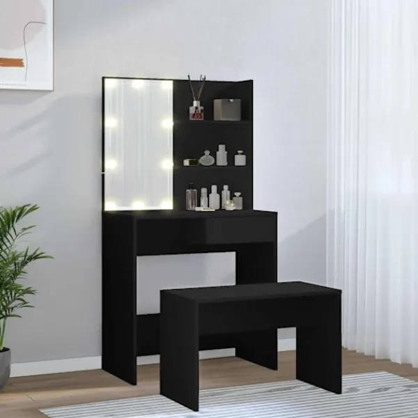 Detta trendiga sminkbord ger ditt sovrum ett tidlöst, elegant utseende. Sminkbordet med LED är ett utmärkt komplement till din sovrumsinredning samtidigt som du har din kosmetika nära till hands! Stabilt material: Det konstruerade träet är av exceptionell kvalitet med slät yta och är också starkt, stabilt och fuktbeständigt.Spegel: Sminkbordet med spegel är perfekt för din dagliga skönhetsrutin. Spegeln låter dig ta hand om din hud och den underlättar när du sminkar dig!Gott om förvaringsutrymme: Sminkbordet med pall har gott om utrymme för enkel åtkomst till smink, smycken och vardagliga nödvändigheter.LED-ljus: Sminkbordet har också LED-lampor med USB, som är enkla att byta läge från varmt till kallvitt. LED-lamporna runt spegeln avger ljus.Breda applikationer: Detta sminkbord är lämpligt för olika scener, till exempel ditt sovrum, garderob och alla andra rum du vill ställa det. Varning:För att förhindra att den välter måste denna produkt användas tillsammans med det medföljande väggfästet.