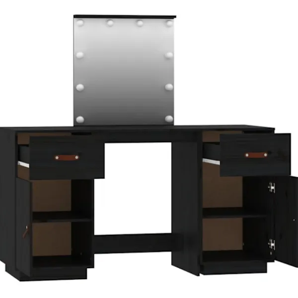 Detta trendiga sminkbord i trä med spegel är ett utmärkt komplement till din sovrumsinredning. Så du kan hålla din kosmetika inom räckhåll! Massivt furuträ: Massivt furuträ är ett vackert naturmaterial. Furuträ har raka fibrer, och knutarna ger materialet sin rustika utstrålning.Gott om förvaring: Sminkbordet har gott om utrymme för enkel åtkomst till smink, smycken och vardagliga nödvändigheter.Spegel: Den medföljande vackra spegeln ger en tydlig bild när du sminkar dig och utstrålar en elegant känsla på bordet.LED-ljus: Spegeln har också LED-lampor med USB, som är enkla att byta läge från varmt till kallvitt. LED-lamporna runt spegeln avger ljus.Praktisk dörr: Håll dina väsentligheter fria från damm genom att gömma dem i detta skåp. Varning:För att förhindra att den välter måste denna produkt användas med den medföljande monteringsanordningen för vägg Observera:Varje produkt levereras med en monteringsmanual i lådan för enkel montering.