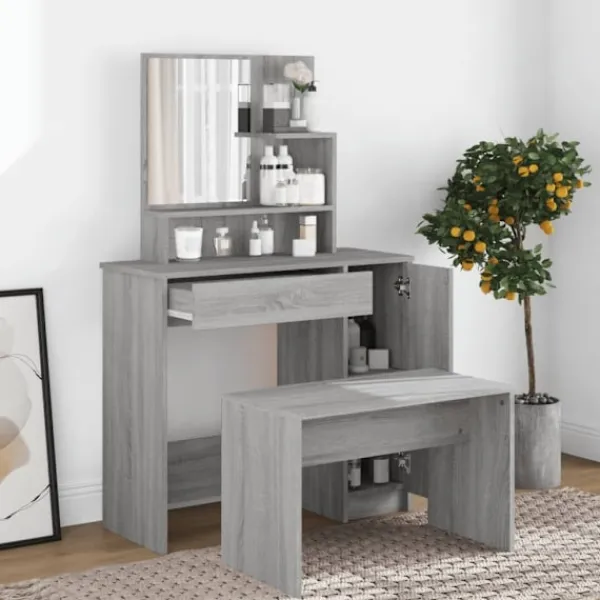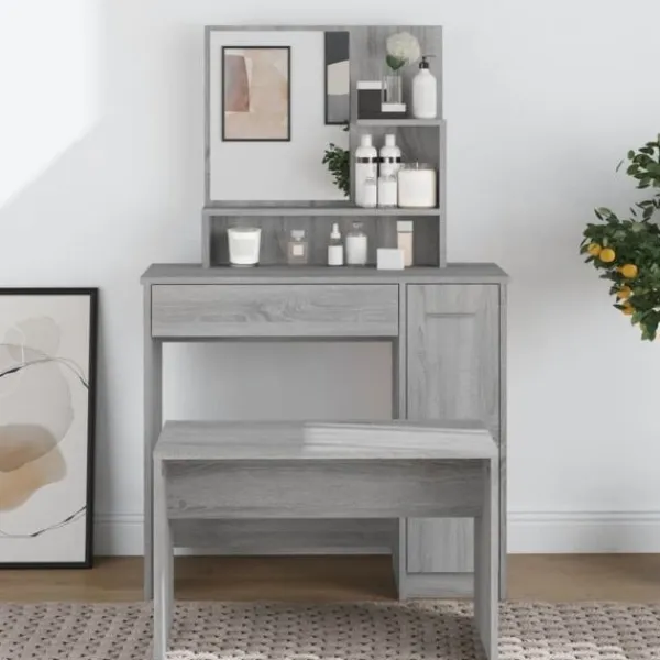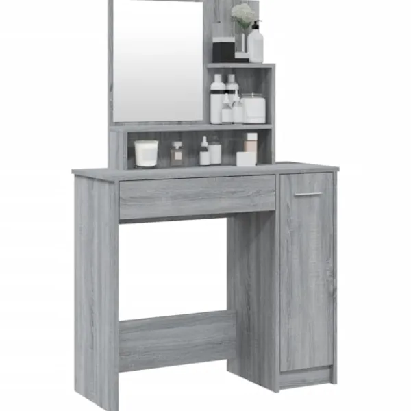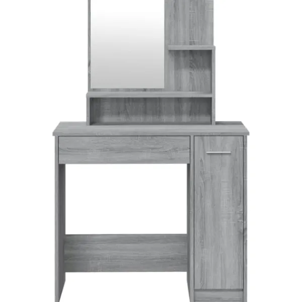 Detta sminkbord ger ditt sovrum ett tidlöst, elegant utseende. Sminkbordet med spegel är ett utmärkt komplement till din sovrumsinredning samtidigt som du har din kosmetika nära till hands! Praktiskt material: Det konstruerade träet är av exceptionell kvalitet med slät yta och har också styrka, stabilitet samt motståndskraft mot fukt. Det är tillverkat av konstruerat trä och är enkelt att rengöra.Gott om förvaring: Lådan och de öppna hyllorna på sminkbordet erbjuder plats för sminkartiklar och allt har sin plats.Spegel: Spegeln är en bra hjälp när du sminkar dig och utstrålar en elegant känsla på bordet.Praktisk dörr: Håll ordning i ditt hem genom att gömma småsaker bakom bordets dörrar. Varning:För att förhindra att den välter måste denna produkt användas med den medföljande monteringsanordningen för vägg Observera:Varje produkt levereras med en monteringsmanual i lådan för enkel montering.