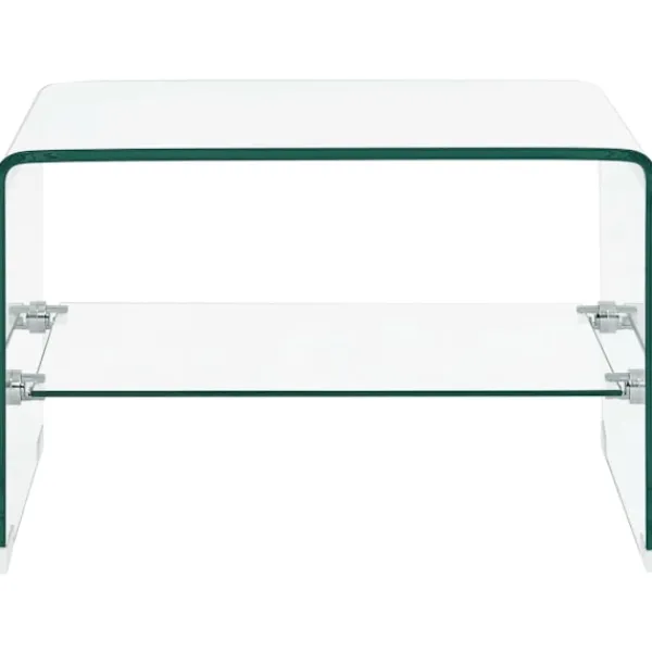 Presentera en modern charm i din inredning med detta soffbord i minimalistisk och tidlös stil! Soffbordet är tillverkat av härdat säkerhetsglas som är säkrare och starkare än vanligt glas. Tack vare den inbyggda hyllan hjälper detta praktiska soffbord dig att hålla ordning i ditt vardagsrum, och är perfekt för böcker, tidskrifter samt andra småsaker som du vill förvara inom räckhåll. Bordets stadiga konstruktion gör det ytterst hållbart. Slappna av och njut av en trevlig stund med vänner och familj runt detta unika soffbord!