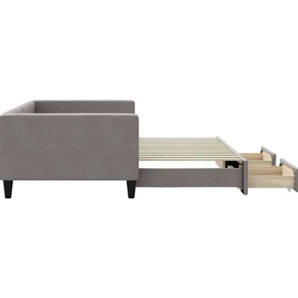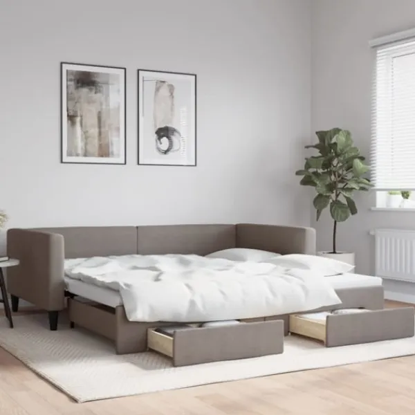 Denna 2-i-1-dagbädd med extrabädd, som kan användas som både soffa och säng, blir ett praktiskt och iögonfallande tillskott till ditt vardagsrum eller sovrum. Mångsidig dagbädd: Bäddsoffan fungerar som en soffa under dagen och kan enkelt omvandlas till en dubbelsäng på natten genom att dra ut extrasängen, vilket är en bekväm lösning för övernattande gäster och för att maximera ytan. Gott om förvaringsutrymme: Denna gästsäng har två lådor med hjul med gott om utrymme för förvaring av dina kläder, strumpor, leksaker, kuddar etc. Slitstarkt tyg och solid konstruktion: Denna dagbädd har en robust ram av trä och metall och är klädd i slitstarkt och mjukt tyg. Bra att känna till:Madrasser medföljer inte denna dagbädd. Vi säljer ett urval av madrasser. Du kan titta i vår shop för matchande madrasser.