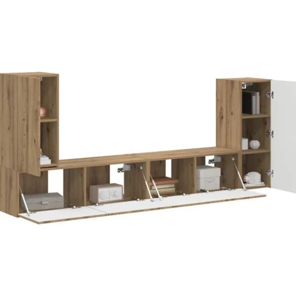 - Mångsidig design: Med justerbara hyllor och olika förvaringsalternativ anpassar sig setet lätt efter olika behov. Oavsett om du ska förvara elektronik, böcker eller dekorationer, är varje del designad för att vara funktionell utan att tappa stilen. Den sammanhållna designen gör att det passar alltifrån spelutrustning till fotoalbum.