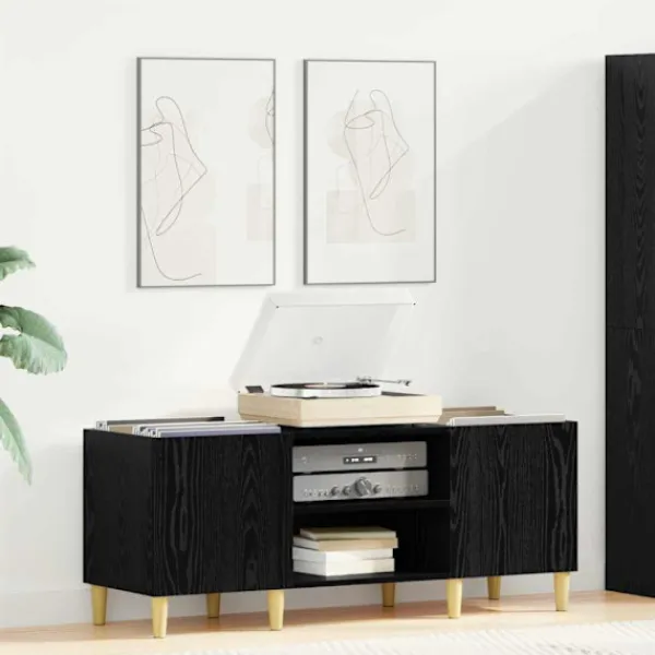 - Material av konstruerat trä: Skivskåpet är gjort av slitstarkt trä som klarar vikten av många vinylskivor och ger en snygg finish.