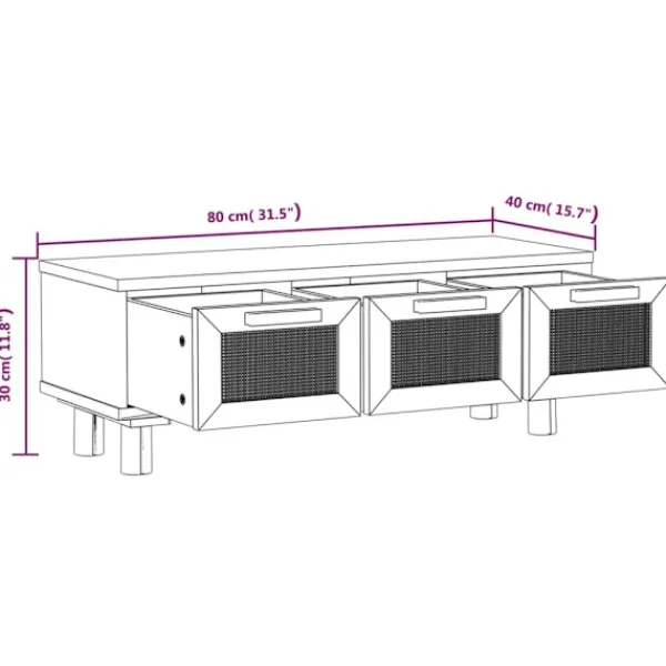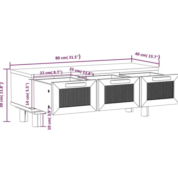 Med detta eleganta soffbord får du en känsla av elegans i din nuvarande heminredning. Hållbart material: Det konstruerade träet är av exceptionell kvalitet med slät yta och är också starkt, stabilt och fuktbeständigt.Gott om lagringsutrymme: Med 3 lådor med rottingdesign erbjuder sidobordet gott om lagringsutrymme för att hålla dina tidskrifter, böcker, DVD-skivor, multimediaenheter och andra dekorativa föremål välorganiserade och inom räckhåll.Träfötter: Träfötterna ger produkten ett naturligt och behagligt utseende samtidigt som stabiliteten säkerställs. Den smälter in med vilken inredning som helst. Observera:Varje produkt levereras med en monteringsmanual i lådan för enkel montering.