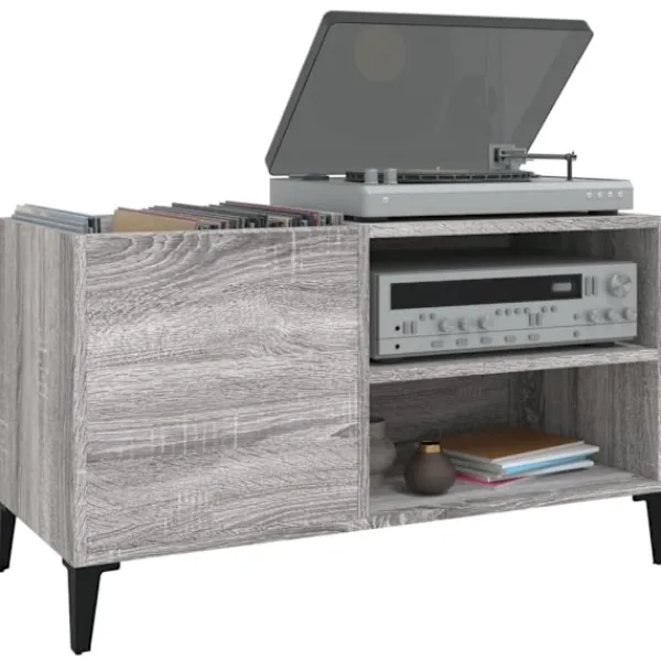 Förvara och visa upp dina vinylskivor med detta praktiska och klassiska skivskåp. Hållbart material: Det konstruerade träet är av exceptionell kvalitet med slät yta och är också starkt, stabilt och fuktbeständigt.Gott om förvaringsutrymme: Det rymliga stereoskåpet erbjuder gott om förvaringsutrymme för LP-skivor och håller din musiksamling välorganiserad.Robust bänkskiva: Den robusta ovansidan av stereoskåpet är perfekt för att placera din skivspelare eller annan elektronik.Multifunktionell: Detta förvaringsskåp kan också användas som ett sidoskåp i vardagsrummet eller ett arkivskåp på kontoret.Metallben: Metallbenen utstrålar en industriell charm i din inredning samtidigt som de är stabila.