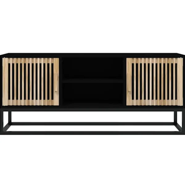 Tack vare sin trendiga och praktiska design blir denna tv-bänk ett riktigt blickfång i ditt rum. Hållbart material: Det konstruerade träet är av exceptionell kvalitet med slät yta och är också starkt, stabilt och fuktbeständigt.Gott om förvaring: Den är utrustad med 2 öppna utrymmen och 2 fack bakom dörrarna med gott om förvaringsutrymme för att hålla tidningar, DVD-skivor och andra föremål välorganiserade.Robust topp: Tv-bänkens överdel är en säker yta för att visa dekorativa föremål, fotoramar eller krukväxter.Metallfötter: Metallfötterna ger din inredning ett lugn stil samtidigt som de säkerställer stabilitet. Bra att känna till:För att göra monteringen så enkel som möjligt, levereras varje produkt med en bruksanvisning.