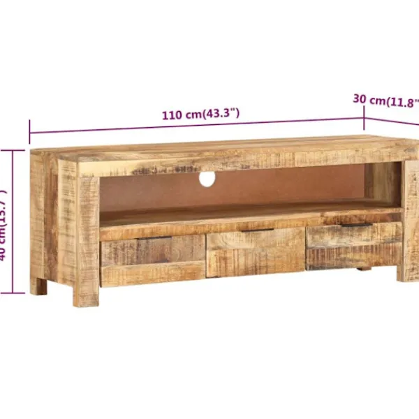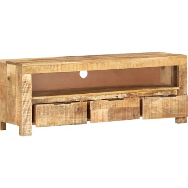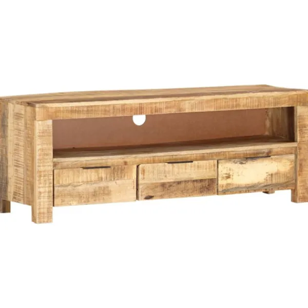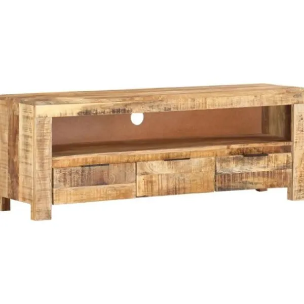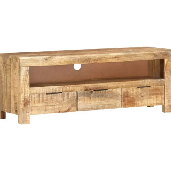 Denna klassiska, unika tv-bänk i trä passar perfekt i sovrummet eller vardagsrummet! Stereobänken är tillverkad av grovt mangoträ, ett tropiskt trä som är mycket starkt. Det är även tåligt, vilket gör den stabil och hållbar. Hantverket och de vackra träådringarna gör varje möbel något unik. Dessutom har mediabänken ett kabelhål, ett utrymme och 3 lådor med gott om förvaringsplats för att förvara det viktigaste organiserat och inom räckhåll. Att tänka på: Färger och ådringar varierar från möbel till möbel, vilket gör varje produkt unik. Leveransen är slumpartad.
