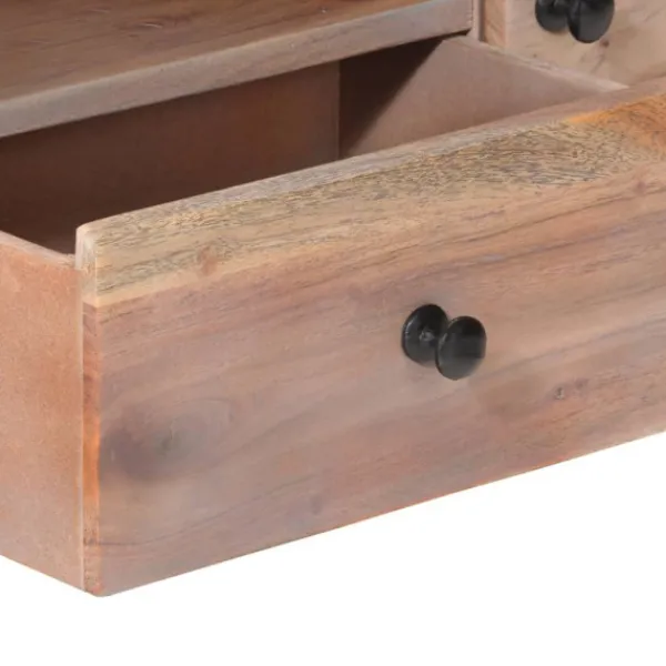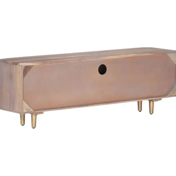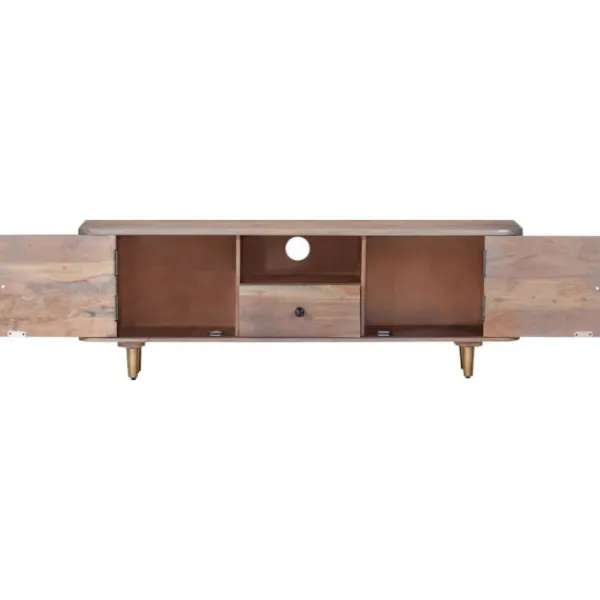 Denna tv-bänk i trä utstrålar en industriell look och passar i vardagsrummet och sovrummet. TV-bänken är tillverkad i massivt akaciaträ, ett lövträ med täta fibrer, vilket gör den stabil och hållbar. Järnbenen bidrar till extra stabilitet och den robusta toppen kan användas för att ställa dina dekorativa föremål. Förvaringsfacket och lådorna har också gott om utrymme för förvaring av dina multimediaapparater, böcker och olika andra föremål. OBS: Färger och ådringar varierar från möbel till möbel, vilket gör varje produkt unik. Leveransen är slumpartad.