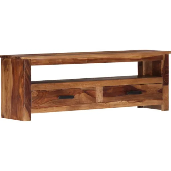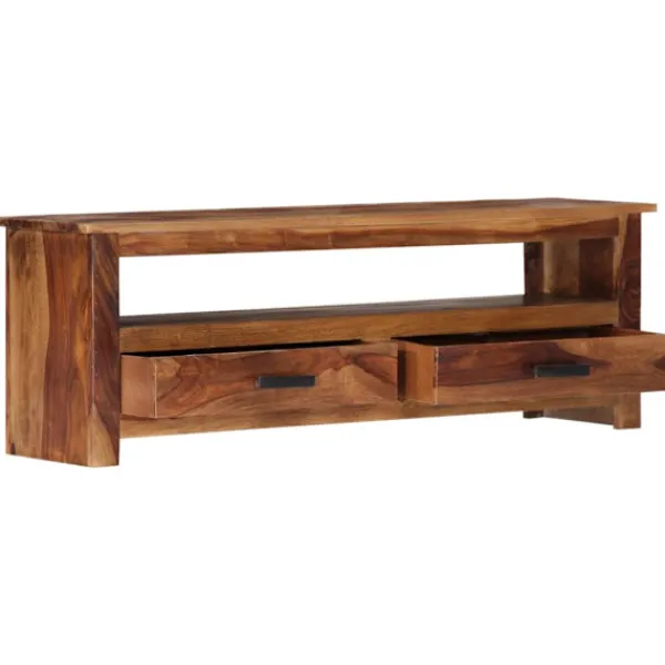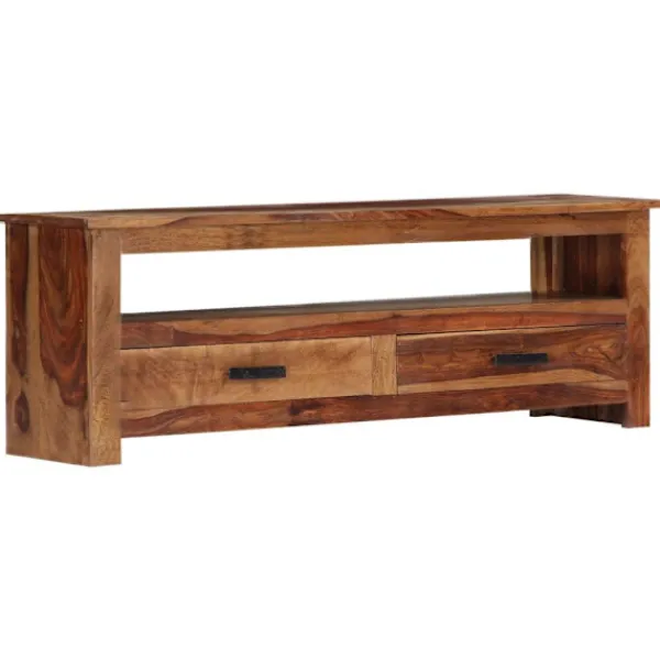 Denna TV-bänk i trä utstrålar en rustik charm. Den blir ett riktigt blickfång i din inredning. Skänken är tillverkad av sheshamträ, även kallat rosenträ eller palisander, vilket är ett tropiskt lövträ som är känt för sina naturliga ådringar och sin släta textur. Det varken böjs eller splittras och har ett naturligt motstånd mot röta. Därför är denna vackert designade skänk mycket stabil, hållbar och iögonfallande. Det mästerliga hantverket garanterar att varje steg av processen utförs med största omsorg, från polering till lackering. Stereobänken är helt handgjord och de estetiskt tilltalande träådringarna gör varje möbel unik och annorlunda. HiFi-bänken har 4 lådor och 1 utrymme med gott om plats för att förvara fjärrkontroller, böcker och andra prylar. Denna produkt är redan monterad; ingen montering krävs. OBS: Träådringarna varierar från möbel till möbel, vilket gör varje möbel unik. Leveransen är slumpartad.