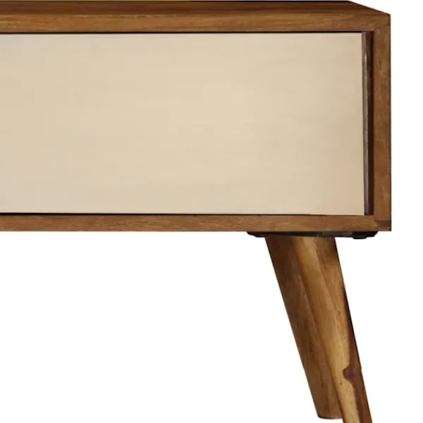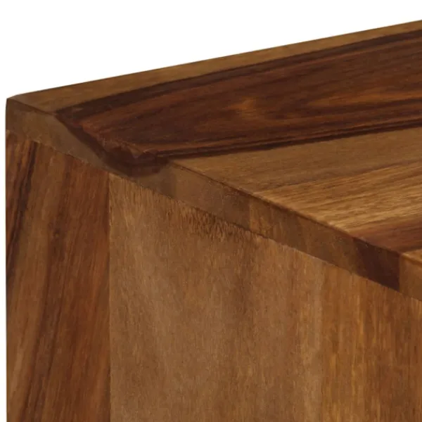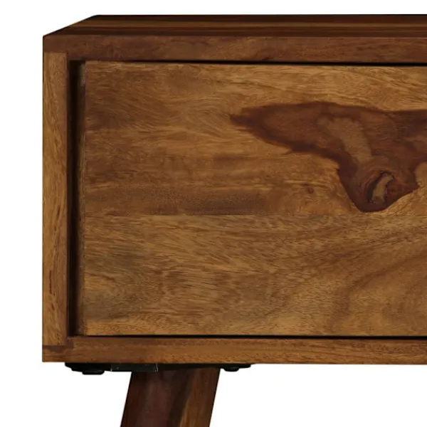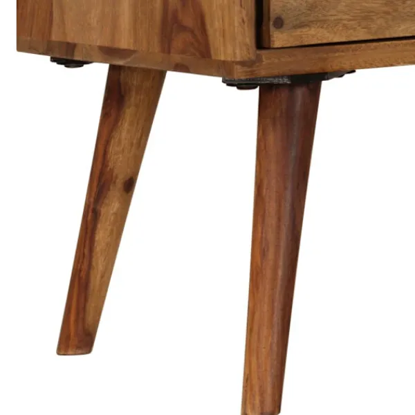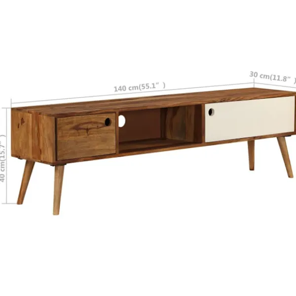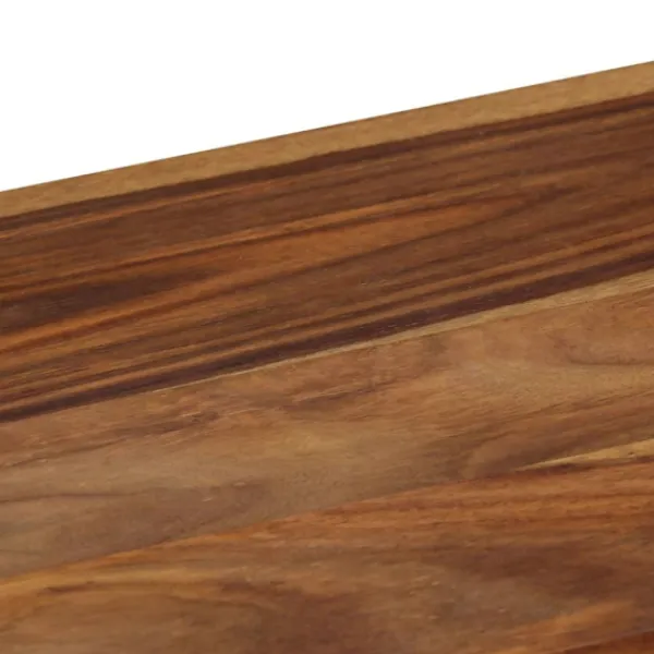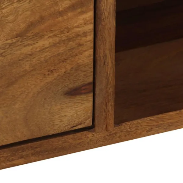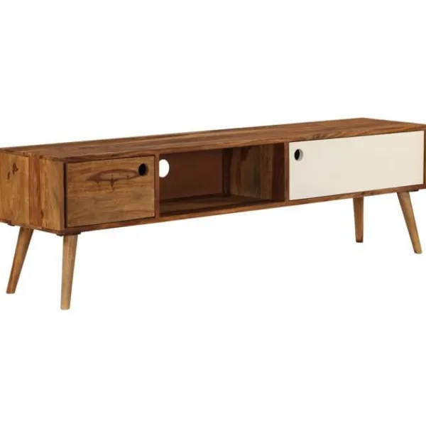 Denna TV-bänk i massivt sheshamträ är elegant och praktiskt. Det kan även användas som ett förvaringsskåp eller en skänk. Den eleganta designen gör TV-bänken till en fokuspunkt i rummet. TV-bänken i trä har en robust ovansida där du kan ställa dekorativa föremål som fruktkorgar eller vaser. Dess 3 stora utrymmen ger extra förvaringsplats för böcker, snacks och andra privata tillhörigheter. TV-bänken är tillverkat i massivt sheshamträ. Shesham är ett tropiskt lövträ som är känt för sina rika ådringar och kallas även rosenträ eller palisander. Dess vackra träådringar gör varje möbel unik och något annorlunda än nästa. De starka stålbenen bidrar till den stadiga konstruktionen. Vår TV-bänk är lätt att montera. OBS: Färgerna kan variera från produkt till produkt, vilket gör varje möbel unik. Leveransen är slumpartad.