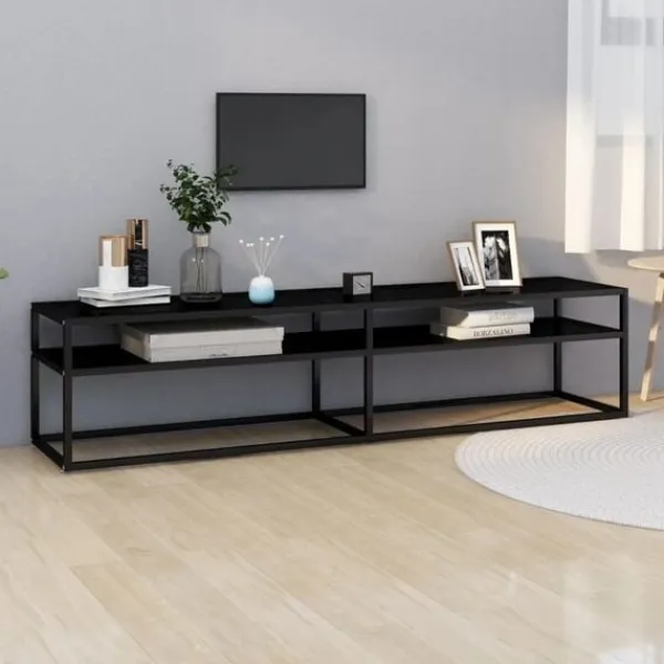 Tv-bänken med en stilren och slimmad design blir ett praktiskt tillskott i ditt hem. Stereobänken är tillverkad i härdat glas som är robust och stabilt. Den är även enkel att rengöra med en fuktig trasa. Den pulverlackerade stålramen gör den stadigare. Hyllan under bordsskivan har gott om plats för att hålla dvd:er, mediaenheter, böcker och andra småsaker organiserade och inom räckhåll.