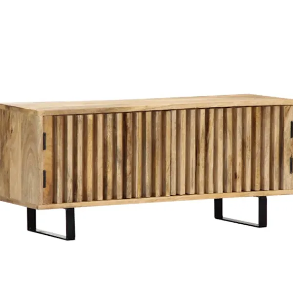 HiFi-bänken är tillverkad i massivt mangoträ, ett lövträ med täta ådringar. Grovt mangoträ har inte bara styrkan att bära vikten, det står även emot tidens tand. Därför är denna vackert designade bänk väldigt stabil, hållbar och iögonfallande. Denna stereobänk är dessutom helt handgjord, det skickliga hantverket och de estetiskt tilltalande träådringarna gör varje möbel distinkt och något annorlunda än de andra. Skänken har 1 skåp med 2 luckor, och därför gott om plats för att förvara dina mediaenheter, böcker och andra saker.