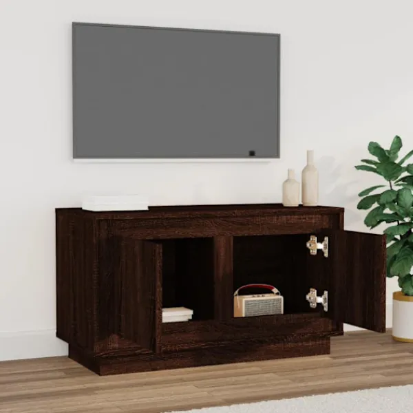 Tack vare sin trendiga och praktiska design blir denna tv-bänk ett riktigt blickfång i ditt rum. Hållbart material: Det konstruerade träet är av exceptionell kvalitet med slät yta och är också starkt, stabilt och fuktbeständigt.Gott om förvaring: Med 2 förvaringsfack har tv-möbeln gott om förvaringsutrymme för att hålla tidningar, DVD-skivor och andra föremål välorganiserade.Robust topp: Tv-bänkens överdel är en säker yta för att visa dekorativa föremål, fotoramar eller krukväxter.Praktiska dörrar: Håll dina väsentligheter fria från damm genom att gömma dem i denna medieenhet. Bra att känna till:För att göra monteringen så enkel som möjligt, levereras varje produkt med en bruksanvisning.
