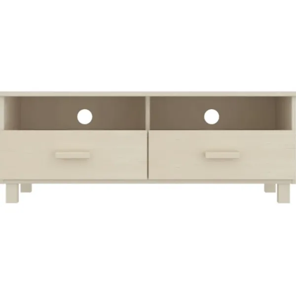 Tv-bänken är tillverkad i massivt furuträ, vilket gör den stabil och robust. Tv-enheten har 2 lådor och 2 fack, med gott om lagringsutrymme för att hålla dina multimediaapparater, böcker och andra föremål välorganiserade och inom räckhåll. Dessutom är den robusta bordsskivan perfekt för att visa upp dekorativa föremål, fotoramar och krukväxter. Tack vare spåret på baksidan kan du dölja kablarna bakom skåpet för att hålla dem utom synhåll.