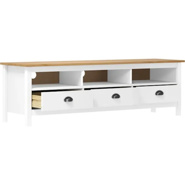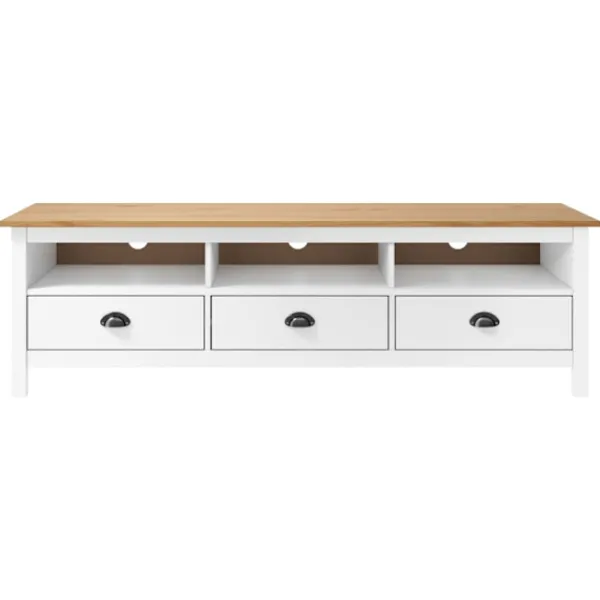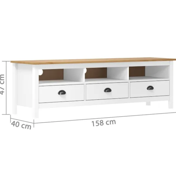 Denna slående TV-bänk har en rustik och retro design som blir mittpunkten i ditt vardagsrum! Denna TV-bänk är tillverkad i massiv furu och är stadig och hållbar. Dess eleganta design gör den till ett användarvänligt och otroligt dekorativt tillskott i ditt hem. Stereobänken har 3 hyllor och 3 lådor med gott om plats för att hålla mindre saker såsom nycklar, anteckningsblock, pennor och andra prylar organiserade och inom räckhåll. Dessutom är den stora ovansidan en perfekt plats för TV, router, mediaenheter eller prydnadssaker.