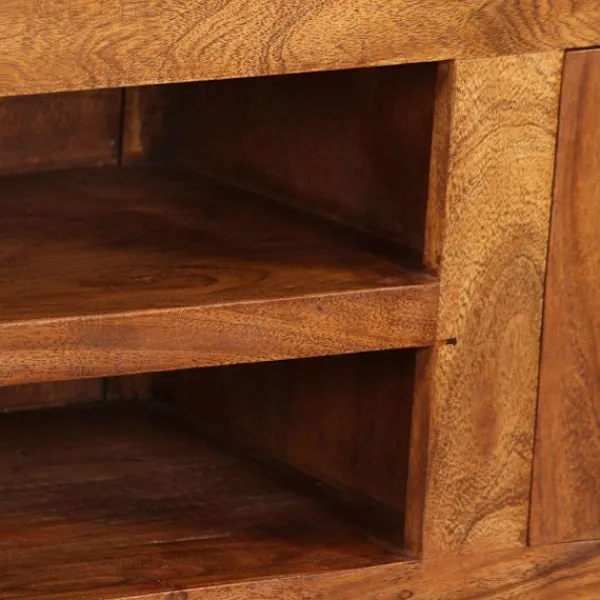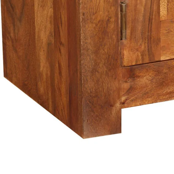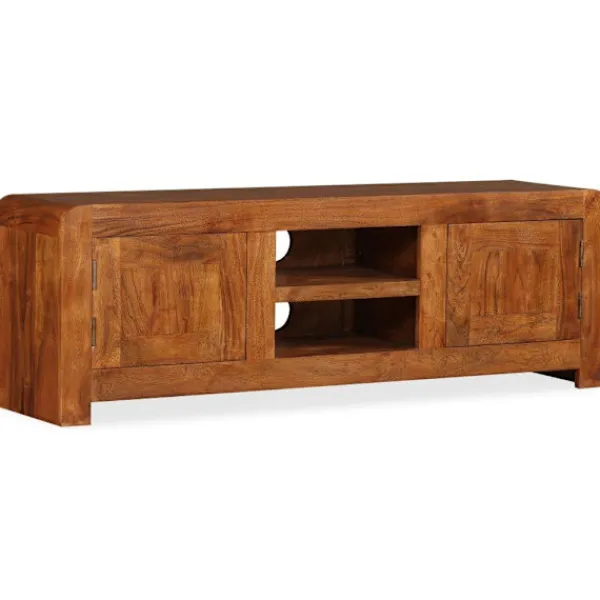 Denna eleganta och praktiska TV-bänk i trä blir ett tidlöst tillägg i ditt hem. Den kan även användas som underskåp, sidobord eller skänk. Tv-bänken är tillverkad i massivt akaciaträ med honungsfinish. Acacia är ett hållbart tropiskt lövträ. Tv-bänken är helt handgjord och de vackra träådringarna gör varje möbel unik. Dess 2 skåp och 2 hyllor har gott om utrymme för lagring av multimediaenheter, mediekonsoler och andra föremål som du vill visa eller hålla inom räckhåll. Varje skåp har en dörr med ett speciellt gångjärn, på detta sätt behöver dörren inte ett dörrhandtag. Denna vara är redan monterad, ingen montering krävs. Viktigt: Färger varierar från möbel till möbel, vilket gör varje möbel unik. Leveransen är slumpartad, vilket säkerställer varje produkts exklusivitet och individualitet.