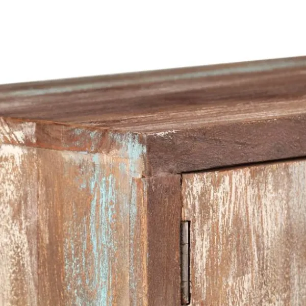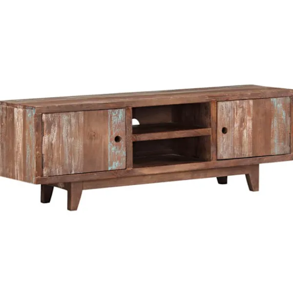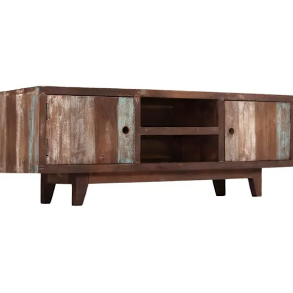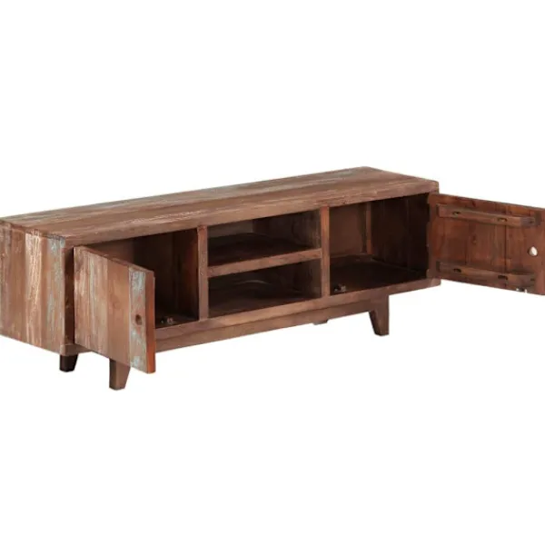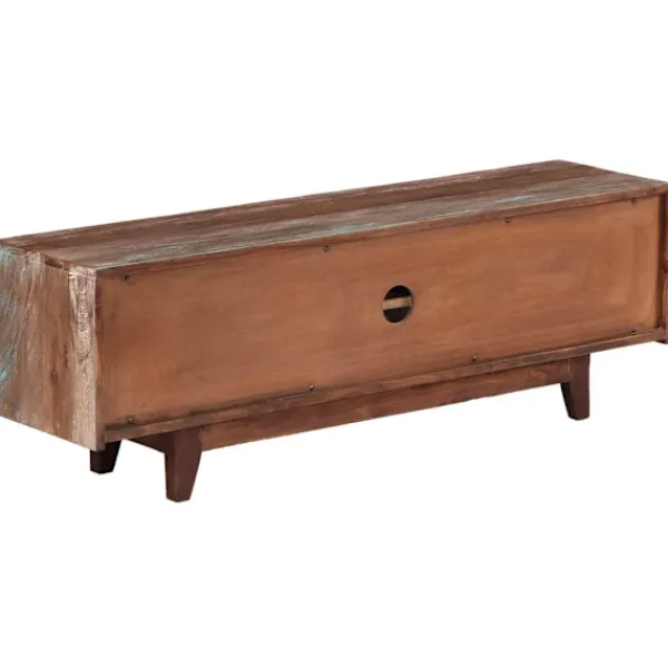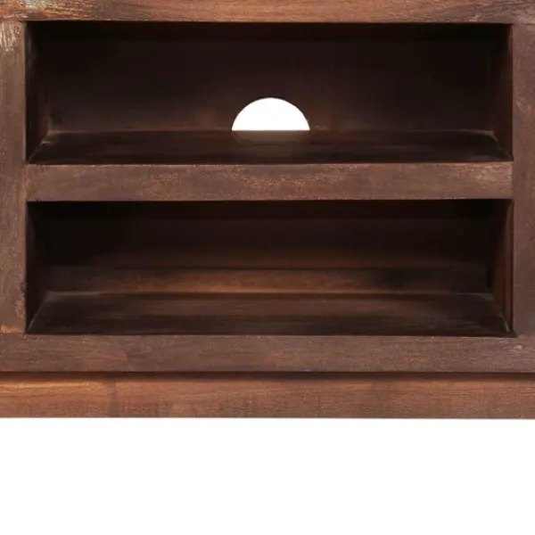 Denna TV-bänk i trä med antik stil utstrålar en vintage charm och blir ett fint tillägg i din inredning. HiFI-bänken är tillverkad i massivt akaciaträ som har belagts med en vacker ytbehandling genom polering, målning och lackering för att få ett elegant utseende. Denna bänk är helt handgjord och de vackra träådringarna gör varje möbel unik och något annorlunda från de andra. Denna TV-möbel har en robust och stabil ovansida där du kan ställa din TV, en fruktkorg, en vas eller andra dekorativa föremål. Skänken har 2 mindre skåp och 2 fack som har gott om utrymme för att förvara dina multimedia-apparater, böcker och andra föremål. Den praktiska kabelutgången låter dig prydligt hålla alla sladdar utom synhåll. Monteringen är enkel. Viktigt: Färger varierar från möbel till möbel, vilket gör varje möbel unik. Leveransen är slumpartad, vilket säkerställer varje produkts exklusivitet och individualitet.