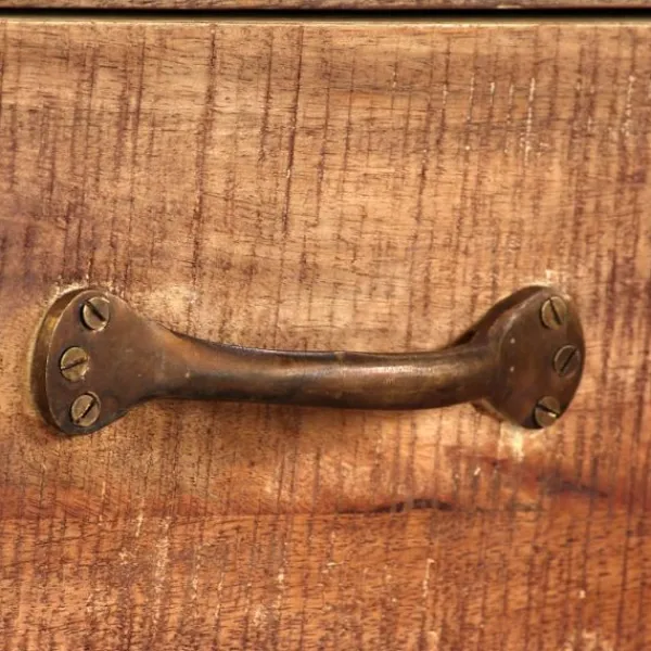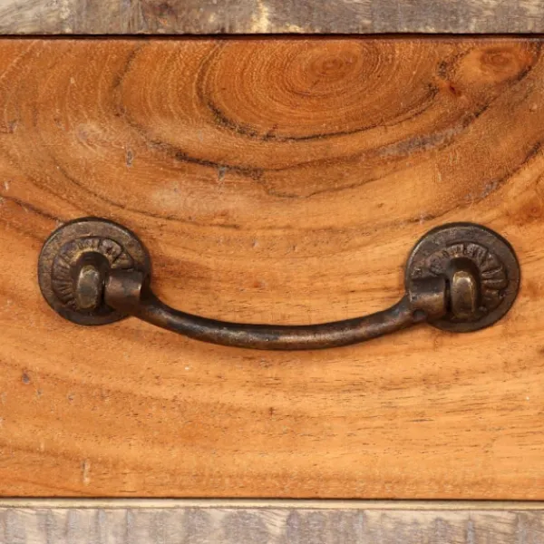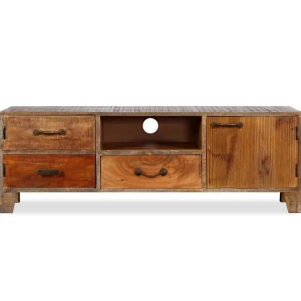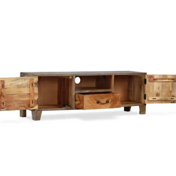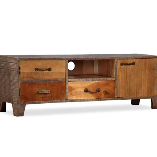 Denna TV-bänk i trä med antik stil utstrålar en vintage charm och blir ett fint tillägg i din inredning. HiFi-bänken är tillverkad i massivt trä som har belagts med en vacker ytbehandling genom polering, målning och lackering för ett elegant utseende. De kontrasterande färgerna ger TV-bänken ett unikt utseende. Bänken är helt handgjord och de vackra träådringarna gör varje möbel unik och något annorlunda från nästa. Denna TV-möbel har en stadig och stabil yta där du kan ställa din TV, en fruktkorg, en vas eller andra dekorativa föremål. Skänken har 1 dörr, 1 fack och 3 lådor med gott om utrymme för att förvara dina multimedia-apparater, böcker och andra föremål. Möbeln är redan monterad så ingen montering krävs. Viktigt: Färger varierar från möbel till möbel, vilket gör varje möbel unik. Leveransen är slumpartad, vilket säkerställer varje produkts exklusivitet och individualitet.