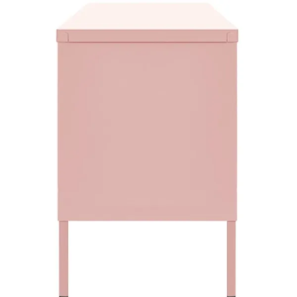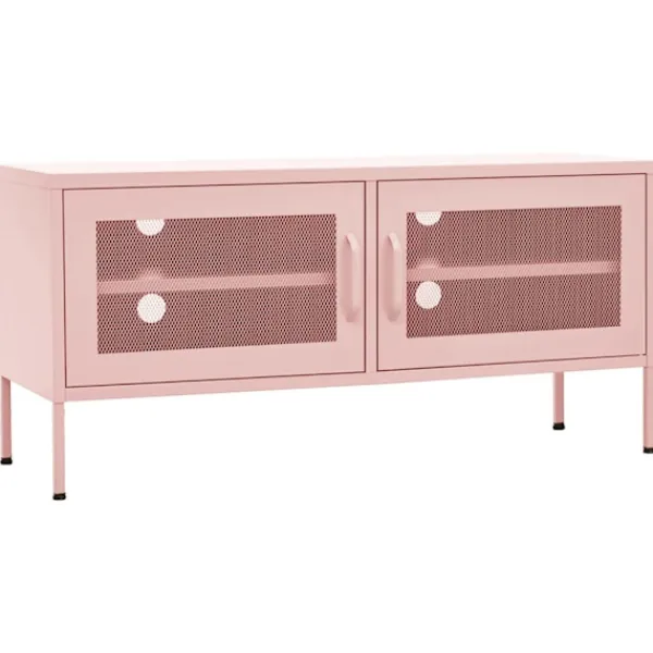 Stålkonstruktionen gör den här TV-möbeln mycket robust och hållbar. Det finns utjämningsdon på undersidan för att justera höjden efter dina behov. TV-stället har 2 nätdörrar med en hylla inuti, med gott om förvaringsutrymme för DVD-skivor, tidskrifter och andra viktiga saker. Dessutom finns det 4 hål på bakpanelen för att organisera kablarna till medier och elektroniska enheter. Den är också lätt att rengöra med en fuktig trasa.