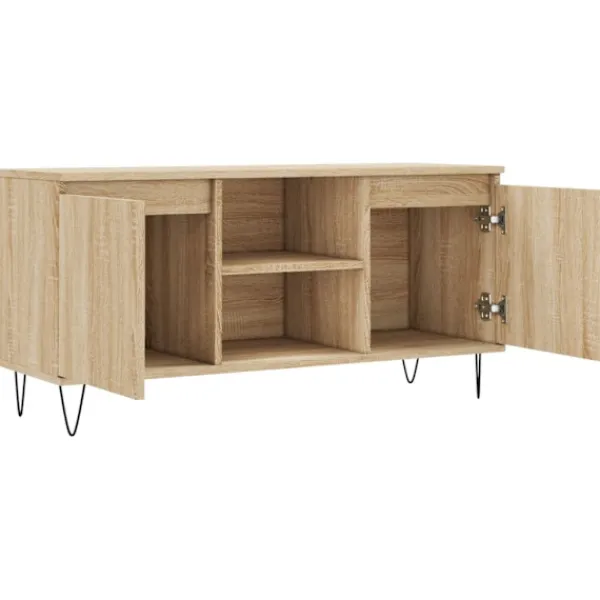 Denna tv-bänk med gott om förvaringsutrymme blir ett praktiskt och iögonfallande tillskott till ditt vardagsrum eller sovrum. Robust material: Det konstruerade träet är av exceptionell kvalitet med slät yta och är också starkt, stabilt och fuktbeständigt. Tv-bänken är tillverkad av konstruerat trä och är lätt att rengöra med en fuktig trasa.Gott om lagringsutrymme: Denna tv-bänk har 4 fack, som erbjuder gott om lagringsutrymme för att hålla dina tidningar, böcker, DVD-skivor och multimediaenheter välorganiserade och inom räckhåll.Stabil ovansida: Tv-bänkens stabila ovansida är perfekt för att placera dina böcker, muggar och dekorativa föremål på.Järnben: Tv-bänkens järnben säkerställer robusthet och stabilitet. Varning:För att förhindra att den välter måste denna produkt användas tillsammans med det medföljande väggfästet.