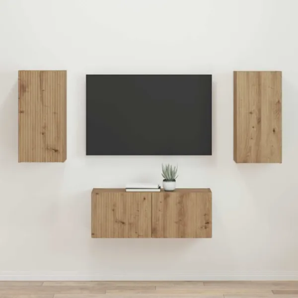 Detta moderna TV-skåpsset är både stiligt och praktiskt för alla hem. Med en snygg minimalistisk design består setet av två skåp i konstruerat trä, perfekta för att visa upp din underhållning eller för att hålla ordning. Setets stil passar bra i trendiga stadsmiljöer såväl som i mysiga förorter, vilket ger en känsla av orden och stil. Materialvalet gör att det både ser bra ut och fungerar bra, vilket gör det idealiskt för dem som vill ha kvalitet och design.
