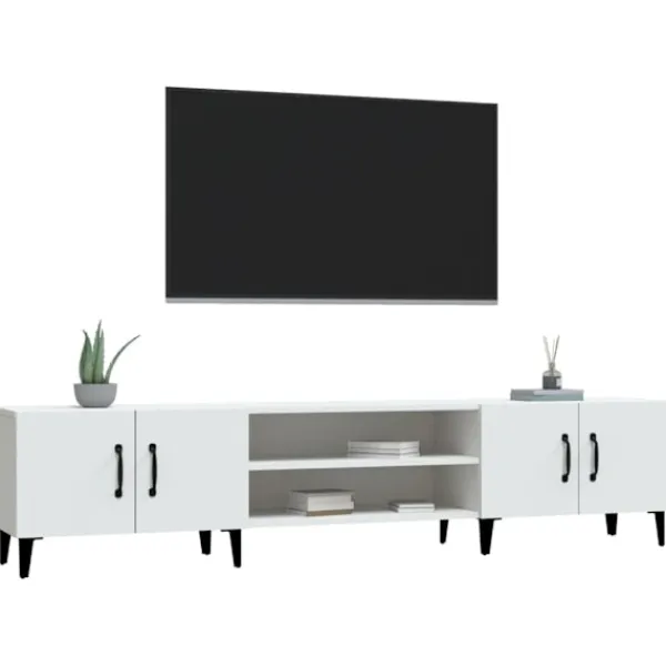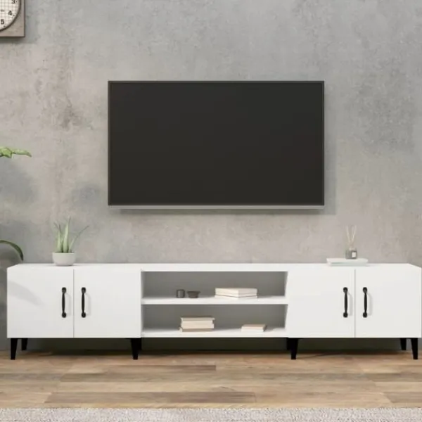 Detta trendiga TV-skåp, med en elegant och stilren design, är tänkt att vara ett dekorativt såväl som praktiskt tillskott till din rumsinredning. Hållbart material: Det konstruerade träet är av exceptionell kvalitet med slät yta och har även styrka, stabilitet och fuktbeständighet.Gott om förvaringsutrymme: TV-skåpet har 4 fack och 4 dörrar, vilket erbjuder tillräckligt med förvaringsutrymme för att hålla dina nödvändigheter väl organiserade och inom räckhåll.Metallfötter: Metallfötterna ger en modern och lugn stil till din inredning samtidigt som de säkerställer stabilitet.Exponeringsfunktion: Den robusta toppen av detta TV-stativ är en perfekt plats för att visa upp krukväxter, inramade foton och andra dekorativa föremål. Bra att veta:För att göra monteringen så enkel som möjligt levereras varje produkt med en manual.
