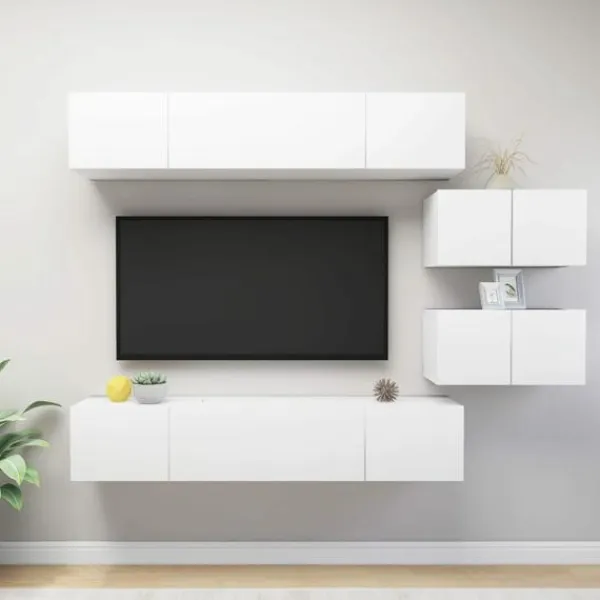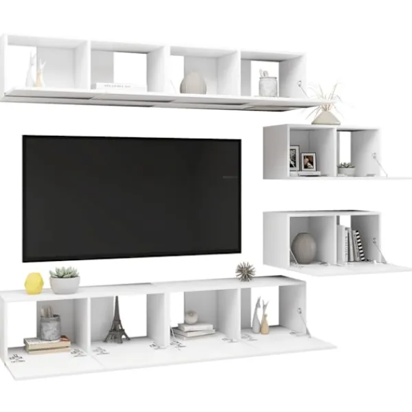 Denna uppsättning TV-skåp med modern design och stort förvaringsutrymme blir en mittpunkt i ditt vardagsrum. Dessa hängande TV-skåp är tillverkade i spånskiva, vilket gör dem robusta och hållbara. Skåpsetet monteras till väggen, vilket gör det till ett tidlöst tillskott i ditt hem. Setet har flera fack som gör det till en bra plats för förvaring av alla dina tidskrifter, DVD-skivor eller andra föremål. Detta skåpset är enkelt att rengöra med en fuktig trasa.