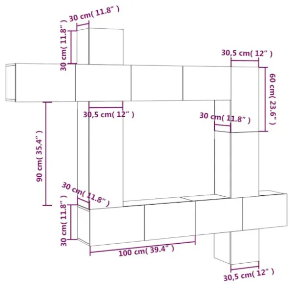 - Mått vänster vertikalt tv-skåp: 30,5 x 30 x 90 cm (B x D x H)