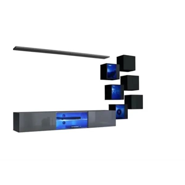 En hylla. Väggmonterad TV-möbel: hylla i glas med blå LED-ljus i mitten, två luckor med push-click öppningssystem stödda av hydrauliska pumpar, bakom varje fack. 3x skåp med delvis glasad dörr med push-click öppningssystem och blå LED-ljus. 3x skåp med push-click öppningssystem, bakom varje ett fack. Mått. Dimension