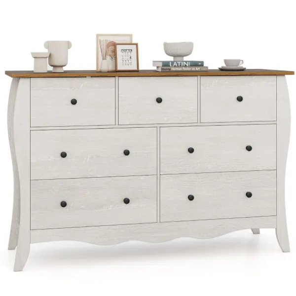 Upplev den perfekta blandningen av mysighet och elegans med vår 7-lådor Farmhouse Dresser, ett elegant tillägg som förvandlar vilket rum som helst till ett varmt och inbjudande utrymme. Denna utsökta byrå är mer än bara en möbel; det är ett uttryck för stil som förhöjer estetiken i ditt vardagsrum, sovrum eller hall. Tillverkad av högkvalitativa material, den här byrån är designad för att motstå påfrestningarna av daglig användning samtidigt som den erbjuder gott om förvaringsutrymme med sina sju hopfällbara lådor. Inkluderandet av två pålitliga tippskyddssatser säkerställer att säkerheten aldrig äventyras, vilket gör det till ett mångsidigt och säkert val för ditt hem.