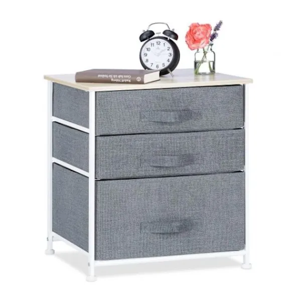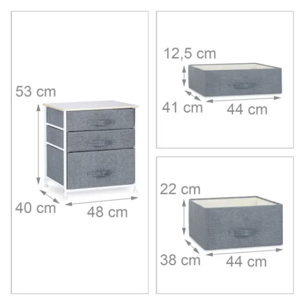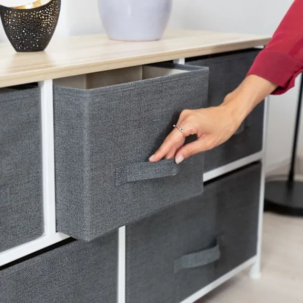Den dekorativa golvstående hyllan med lådor erbjuder snygg organisation med grå tyglådor och en naturlig träfinish. Perfekt för att förbättra hemmets estetik och samtidigt behålla ordningen.
