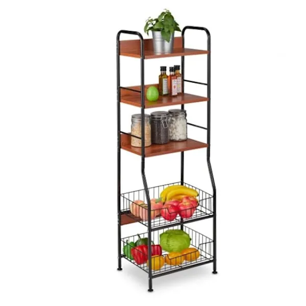 Denna smala förvaringshylla maximerar köksutrymmet och erbjuder organiserad förvaring av grönsaker och redskap. Dess öppna design säkerställer luftflöde och håller produkterna fräscha och tillgängliga.