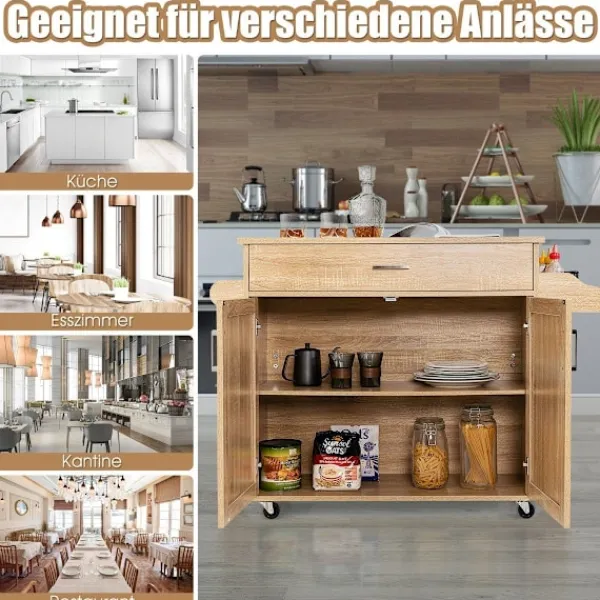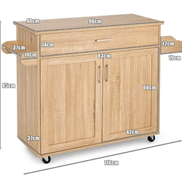 Är du fortfarande orolig för röran i ditt kök? Vår rullande köksvagn är den perfekta arrangören för att hålla ordning och reda i ditt kök. Designad med en rymlig bänkskiva, en stor låda och ett skåp, erbjuder denna vagn gott om förvaringsutrymme för disk, glas, mat och mer. Specialdesignade kryddställ och en handdukshållare gör det enkelt att komma åt handdukar och kryddflaskor när det behövs. Utrustad med 4 universalhjul (varav 2 är låsbara), uppnår den den perfekta balansen mellan bekväm rörlighet och hög säkerhet. Oavsett om du behöver en extra arbetsyta eller vill organisera dina köksredskap bättre, är vår köksvagn det perfekta valet.