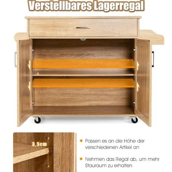 Köksvagnen har en rymlig bänkskiva som gör måltidsberedning enklare, medan den stora lådan ger förvaring för redskap, glas och andra föremål. Skåpet innehåller en 3-läges justerbar hylla för att möta dina varierande förvaringsbehov. Med 4 släta 360° svängbara hjul, varav 2 med bromsar, är vagnen lätt att flytta och säkra på plats, förhindrar plötsliga rörelser och säkerställer säkerhet. Krydd- och handdukshållarna erbjuder bekväm förvaring för enkel åtkomst till föremål. Enkel montering underlättas av en detaljerad bruksanvisning, med alla delar numrerade och varje monteringssteg listat.