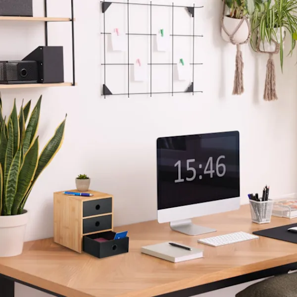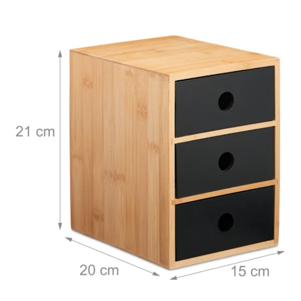 Optimera din arbetsyta med vår skrivbordsarrangör i bambu, med tre rymliga lådor för effektiv förvaring av kontorsmaterial, kosmetika eller smycken.