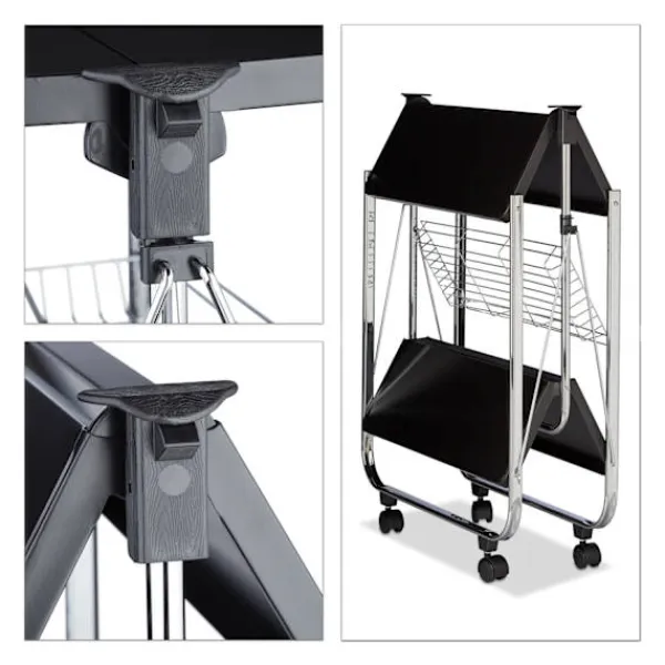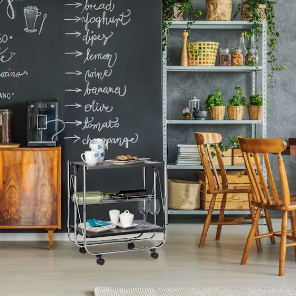 Höj din hemtjänst med denna hopfällbara serveringsvagn i metall, designad för sömlös transport av mat och dryck. Dess vikbara design säkerställer platsbesparande förvaring, perfekt för alla rum.