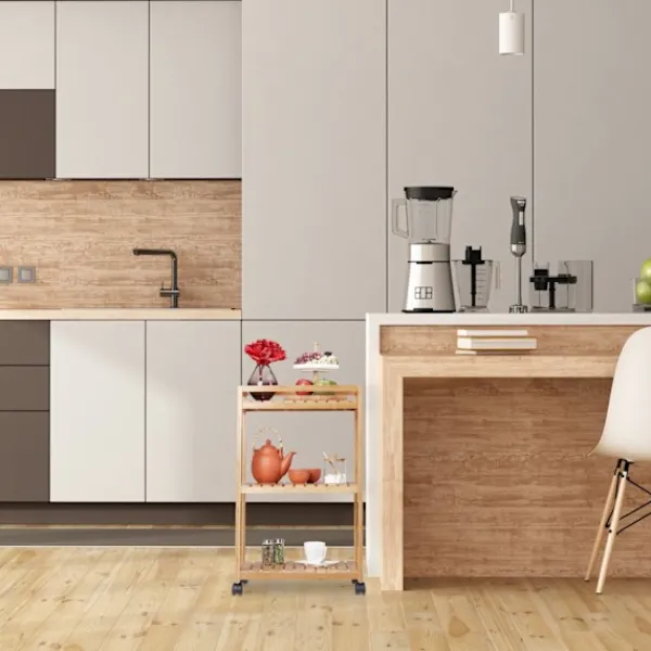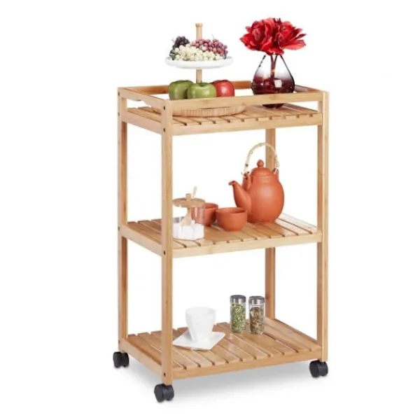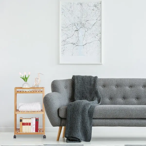 Förbättra ditt hem med en modern serveringsvagn i bambu som erbjuder stil och funktionalitet. Denna mångsidiga vagn är perfekt för att servera frukost på sängen eller som ett elegant sidobord.