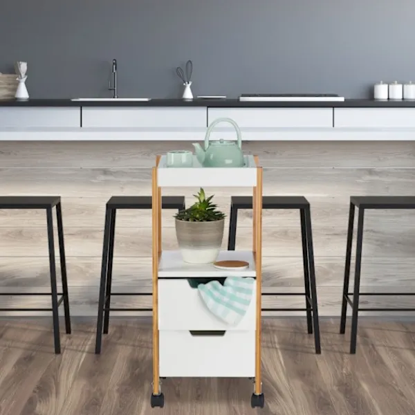 Utrymmesbesparande sidobord på hjul förbättrar hemmets organisation och stil. Denna mångsidiga köksvagn erbjuder en praktisk bricka för att transportera snacks och drycker, perfekt för vardagsrum och kök.