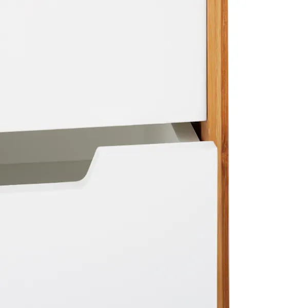 - Levererar en elegant look med vita hyllor och naturliga bambudetaljer.