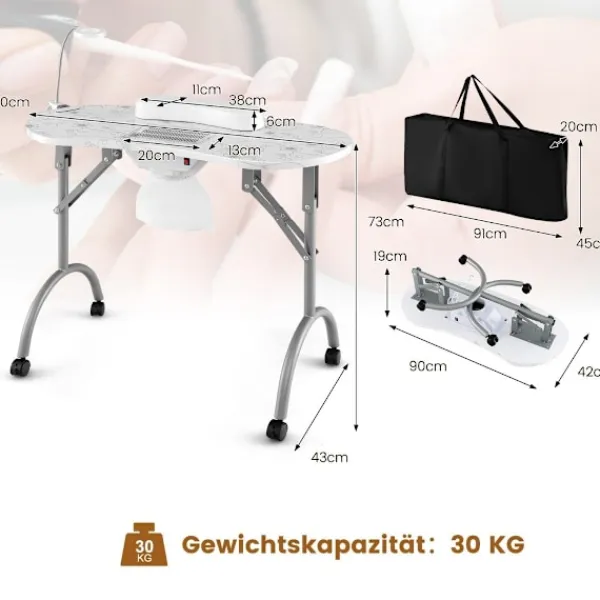 Vårt bärbara manikyrbord på hjul är det perfekta valet för nageltekniker som erbjuder tjänster från dörr till dörr. Denna innovativa manikyrstation är designad för att förbättra din mobila nagelsalongsupplevelse med sina unika egenskaper och fördelar. Till skillnad från andra manikyrbord är våra utrustade med en elektrisk dammuppsamlare, en flexibel LED-bordslampa och en mjuk handledskudde, vilket gör det till ett utmärkt alternativ för proffs.