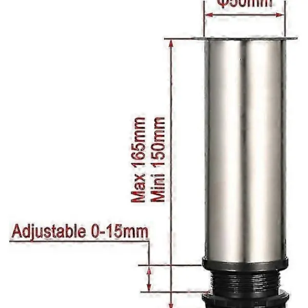 Storlek: 50mm x 150mm (Diameter x Höjd) Material: 304 Rostfritt Stål + Stark ABSTotal Justerbar Höjd: 150mm-165mm Användning: skåp, arbetsbänkar, bord, DIY-möbler, etc. Paketinnehåll: 4 x justerbara fötter; 16 x monteringsskruvar