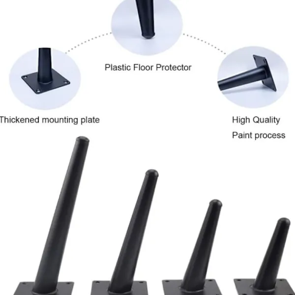 Mått: Höjd 10 cm; Övre rördiameter 40 mm, nedre rördiameter 20 mm. Material: 201 rostfritt stål, svartlackerat, rostfritt och korrosionsbeständigt. Enkel installation: Förmonterad monteringsplatta borrad, levereras med rostfria skruvar. Användningsområde: bänkskiva, soffbord, skrivbord, gör-det-själv-möbler, soffa, etc. Förpackningsinnehåll: 4 lutande bordsben + 16 rostfria skruvar
