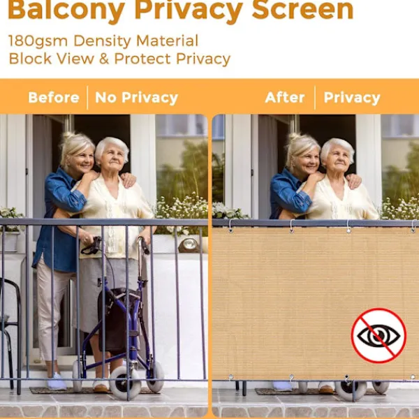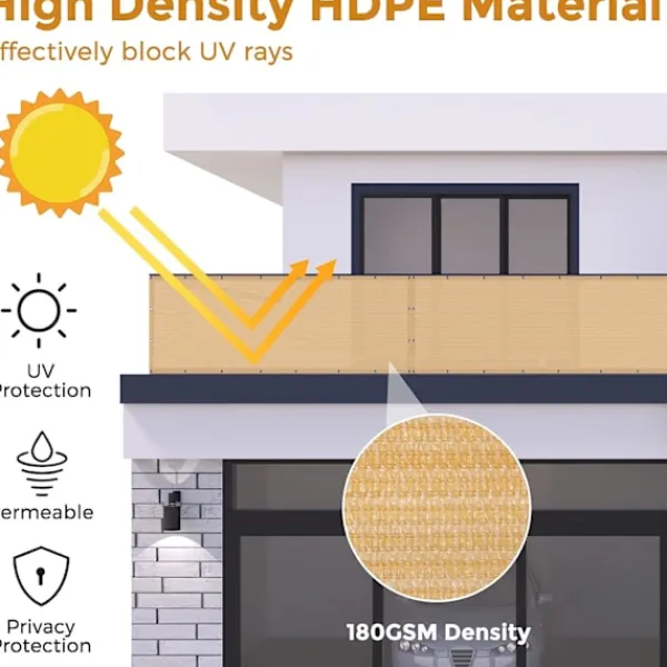 【Balkongskydd】– Sandskydd är tillverkat av 180 g/m² nytt återvunnet material av högdensitetspolyeten (HDPE), mer miljövänligt. Med UV-stabiliserat för att förhindra blekning från solens skadliga UV-strålar för längre användning för att bibehålla materialets styrka.